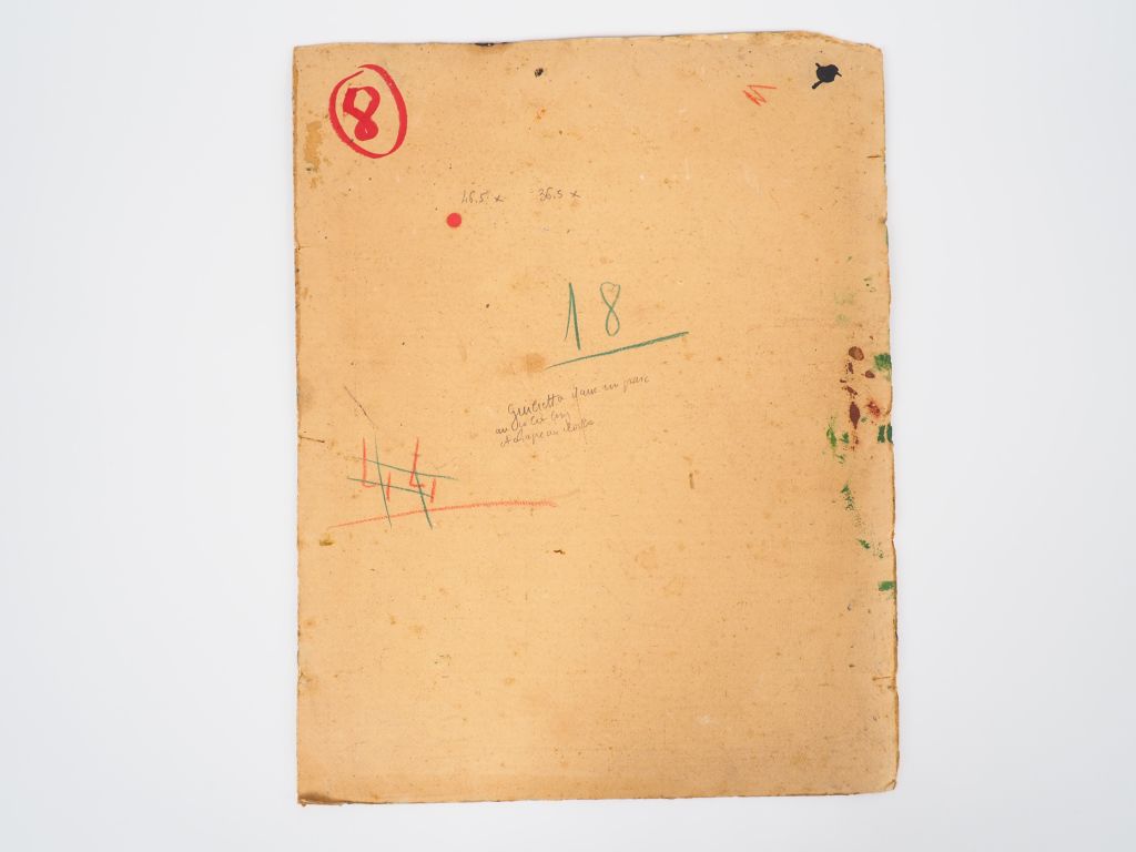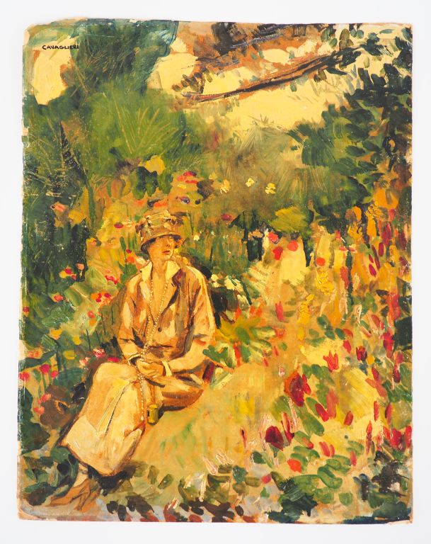 Mario CAVAGLIERI. "Giulietta dans un parc, au collier long et chapeau cloche" Huile sur carton, signée en haut à gauche. Dim. 46,5 x 36,5 cm