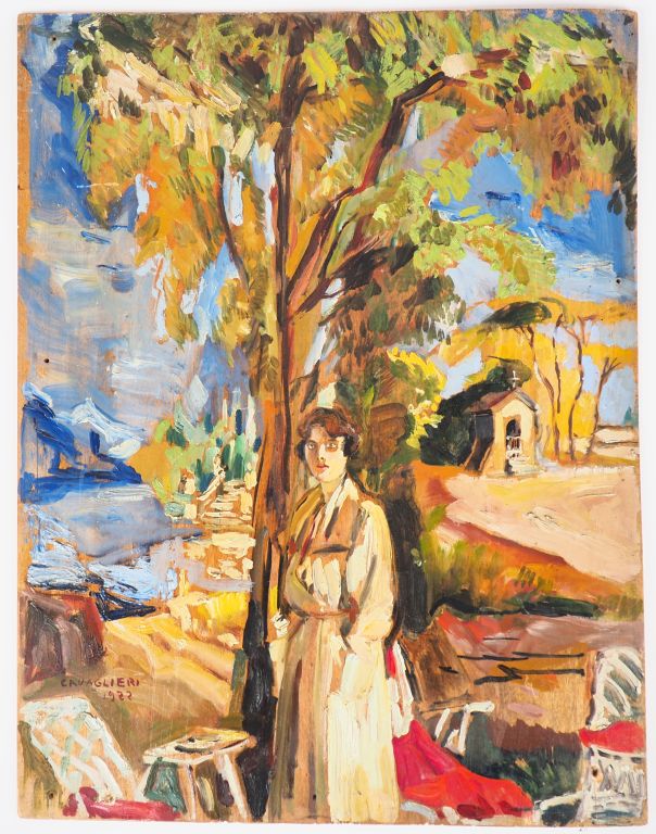 Mario CAVAGLIERI. "Giulietta devant la chapelle" Huile sur carton, signée en bas à gauche et datée 1922 Dim. 47 x 36 cm