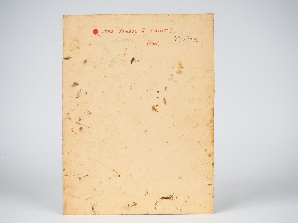 Mario CAVAGLIERI. "Jeune anglaise à Zermatt" Huile sur carton, titrée et datée au dos 1905 Dim. 33 x 24,5 cm
