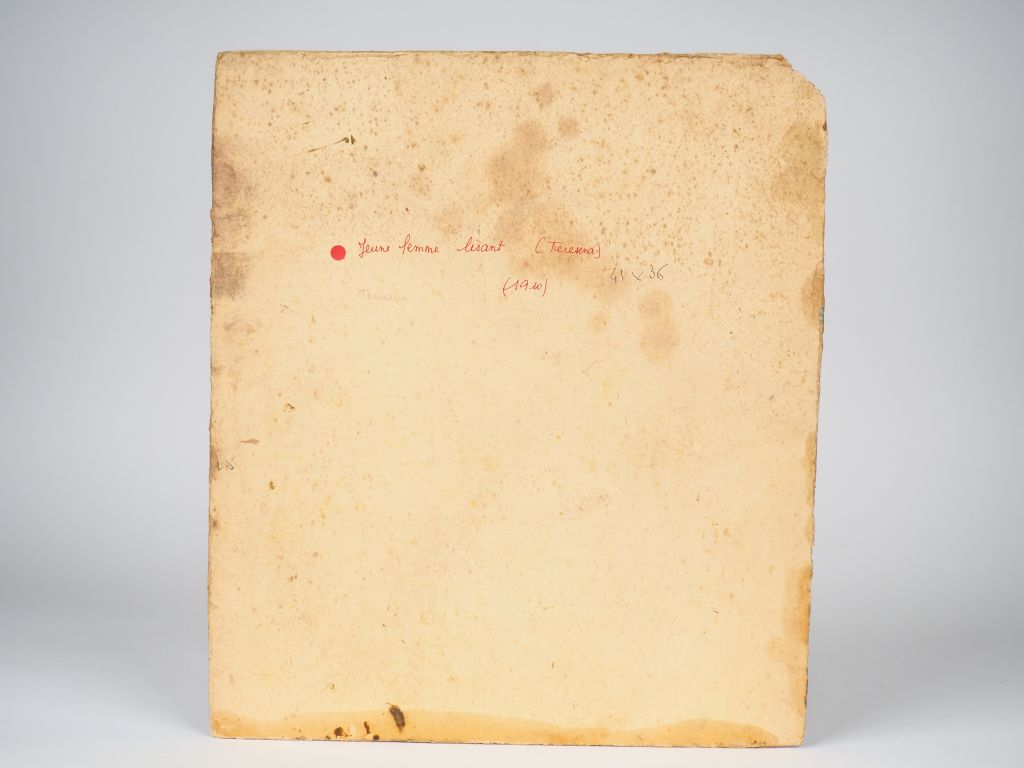 Mario CAVAGLIERI. "Jeune femme lisant" (Térésina) Huile sur carton, titrée et datée au dos 1910 Dim. 412 x 36 cm (angle droit manquant)