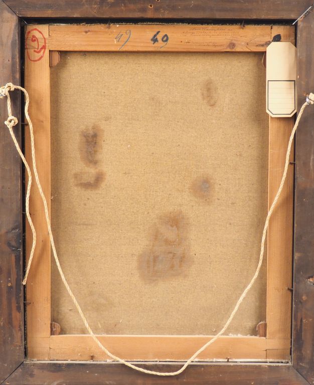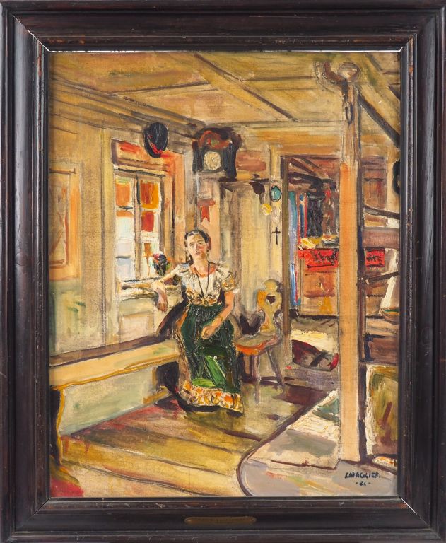 Mario CAVAGLIERI. "Jeune femme pensive à la fenêtre". Huile sur toile, signée en bas à droite et datée 24 Dim. 57 x 45 cm (petits accidents)