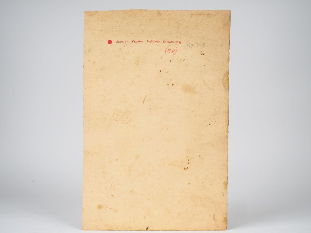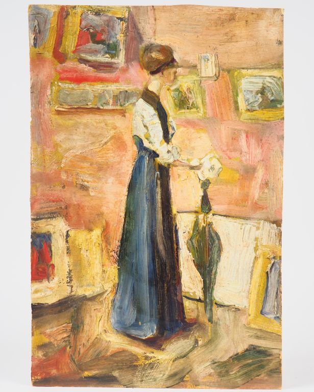 Mario CAVAGLIERI. "Jeune femme visitant l'atelier" Huile sur carton, titrée et datée au dos 1910 Dim. 46 x 30,5 cm