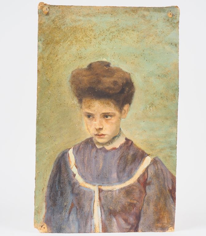 Mario CAVAGLIERI. "Jeune fille en sarreau" Huile sur carton, titrée et datée au dos 1903 Dim. 43 x 27 cm