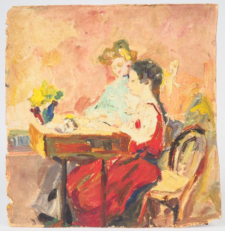 Mario CAVAGLIERI. "La leçon de clavecin" Huile sur carton, titrée et datée au dos 1906 Dim. 38 x 35,5 cm (manques)