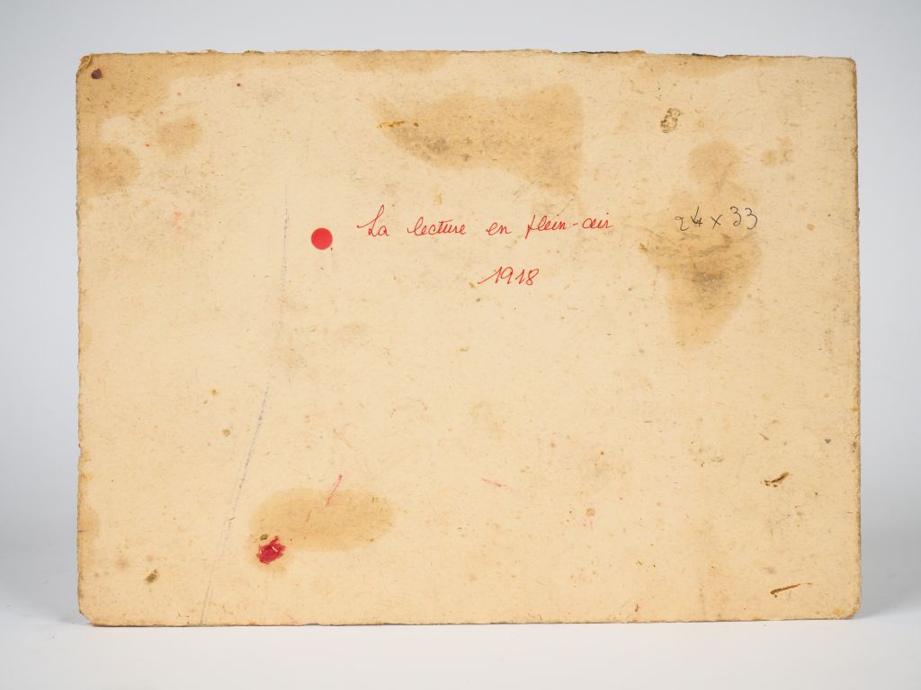 Mario CAVAGLIERI. "La lecture en plein air" Huile sur carton, signée en bas à gauche et datée 1918 Dim. 24 x 33 cm