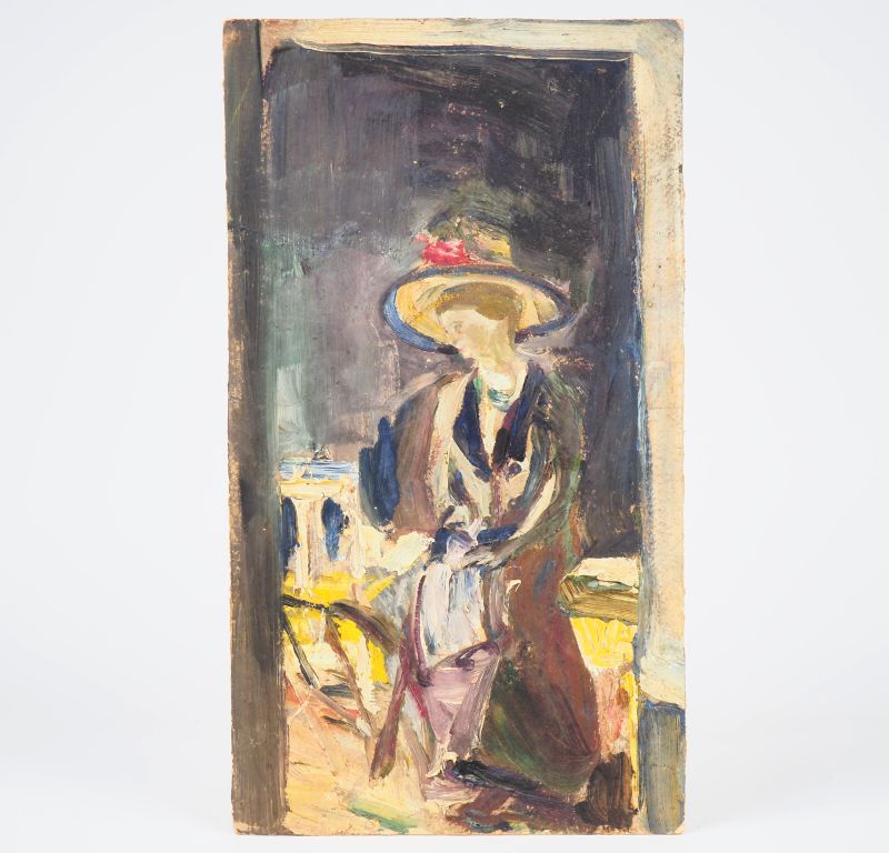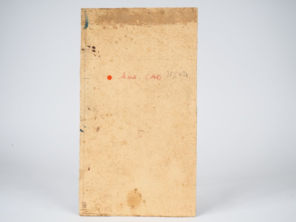 Mario CAVAGLIERI. "La visite" Huile sur carton, titrée et datée au dos 1908 Dim. 37,5 x 21 cm