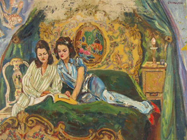 Mario CAVAGLIERI 'Lecture dans la chambre vénitienne'. Huile sur toile signée en haut à droite, titrée et datée 1939 au verso. 54 x 64 cm