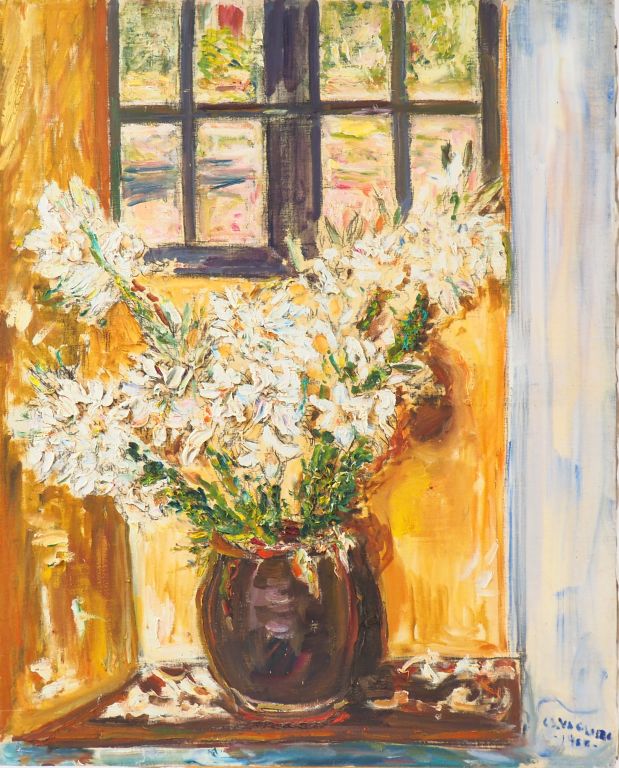 Mario CAVAGLIERI. "Lys devant la fenêtre" Huile sur toile, signée en bas à droite et datée 68 Dim. 80 x 65 cm