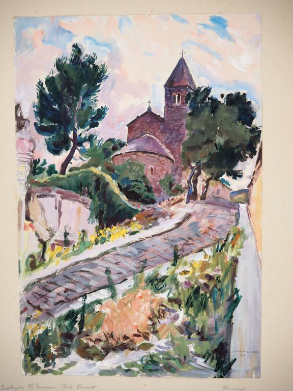 Mario CAVAGLIERI. "Vieille église près de Gênes" Gouache, signée en bas à droite et datée 49 Dim. 47 x 31,5 cm