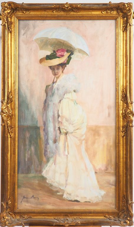 Marius AVY. "Elégante à l'ombrelle". Huile sur toile, signée en bas à gauche. Dim 85 x 45 cm.