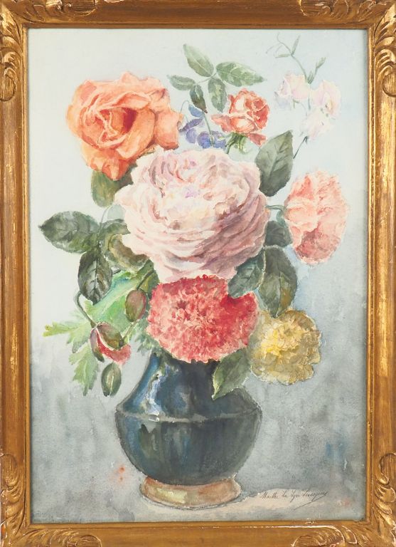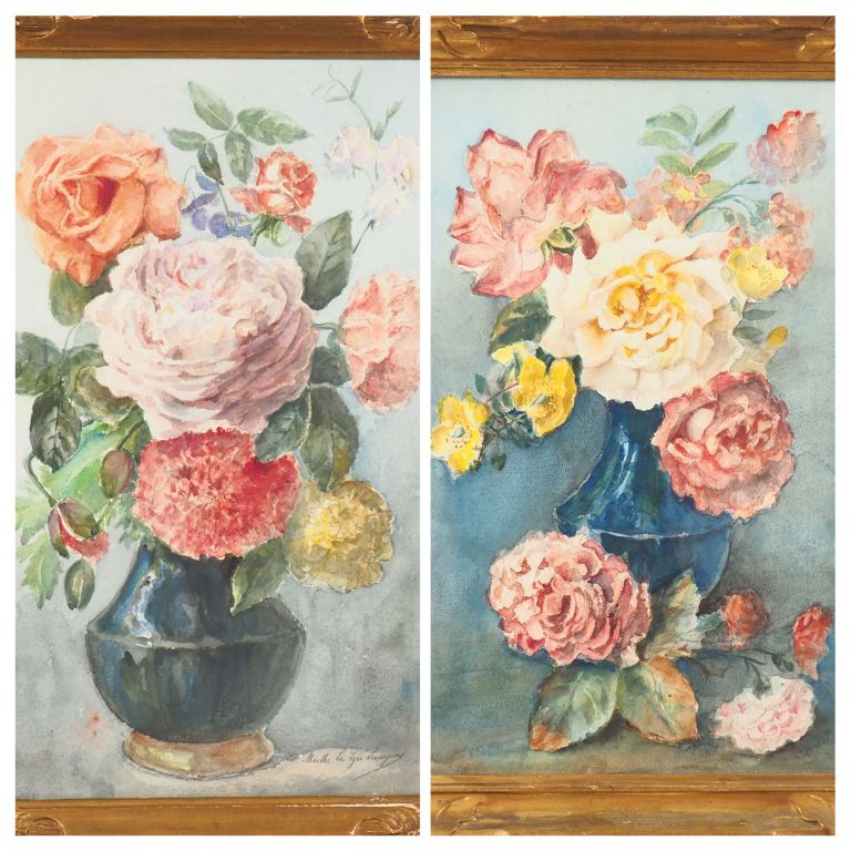 Marthe La LYRE LEVESQUES. "Nature morte aux fleurs". Deux d'aquarelles signées. Dim. 53,5 x 37 cm - 53 x 34,5 cm