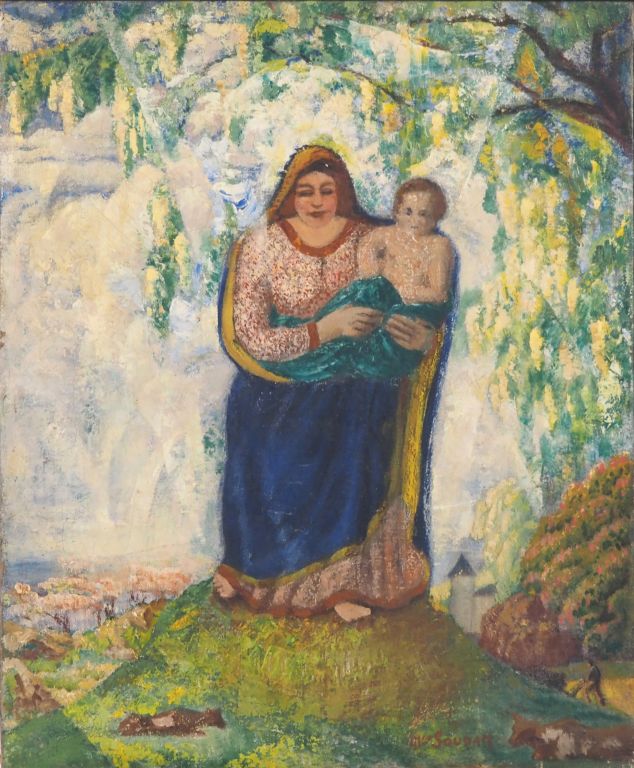 Maurice SOUDAN. "Vierge à l'enfant" Huile sur toile, signée en bas à droite Dim. 46 x 37,5 cm