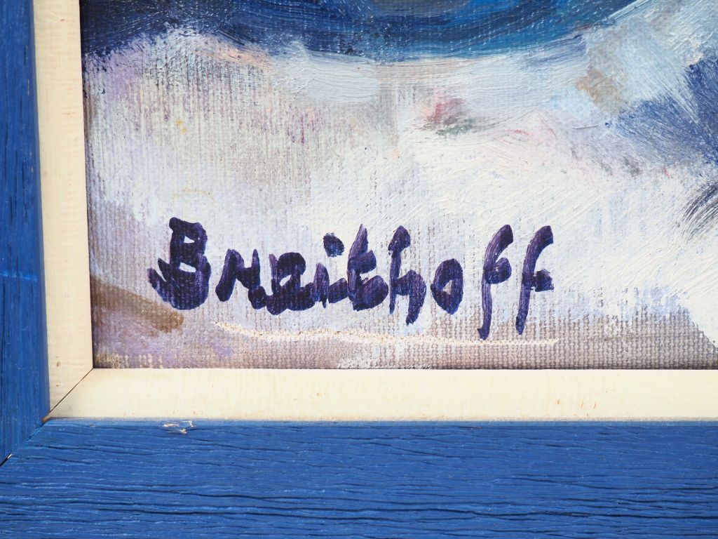 Michel BREITHOFF. "Nature morte aux fruits et au pichet bleu". Huile sur toile signée en bas à gauche. Dim. 51 x 66,5 cm.