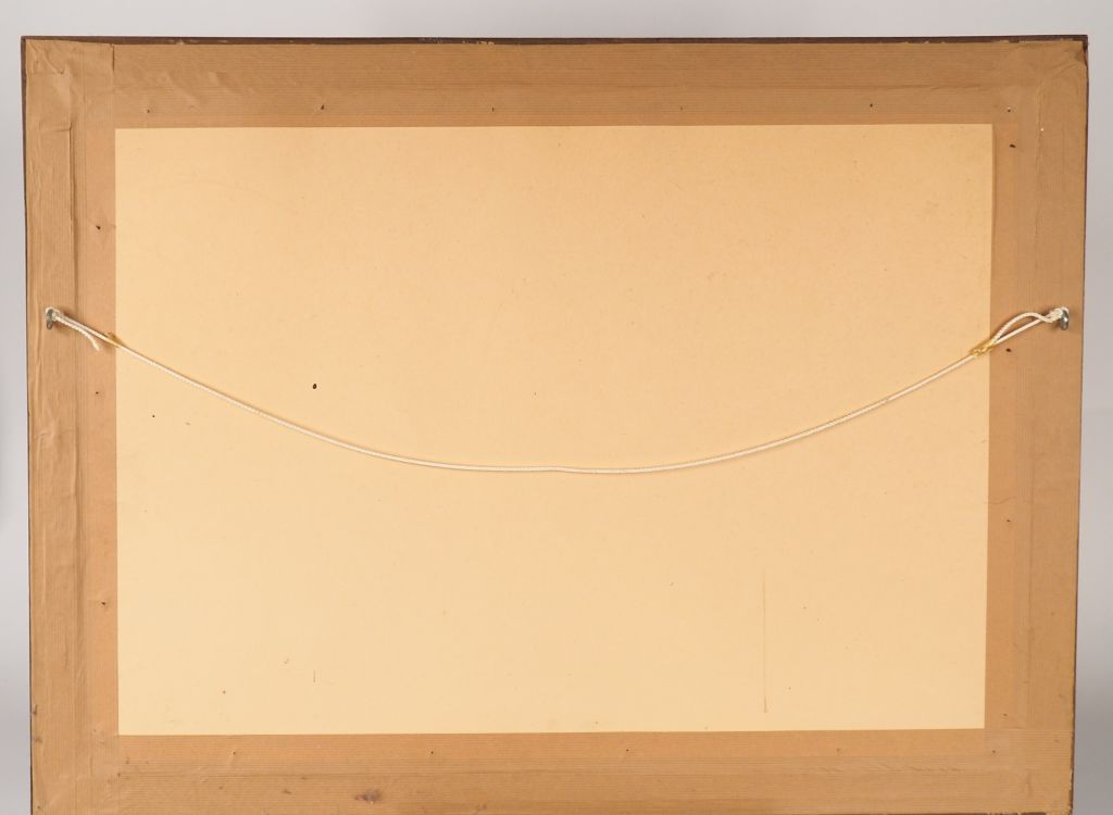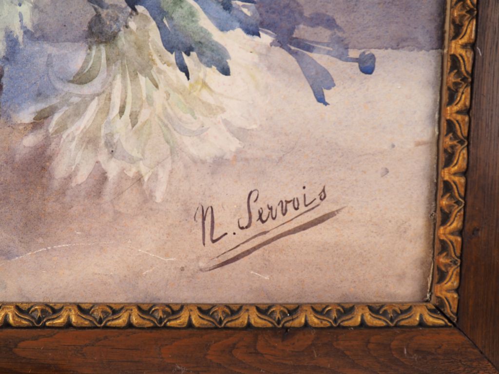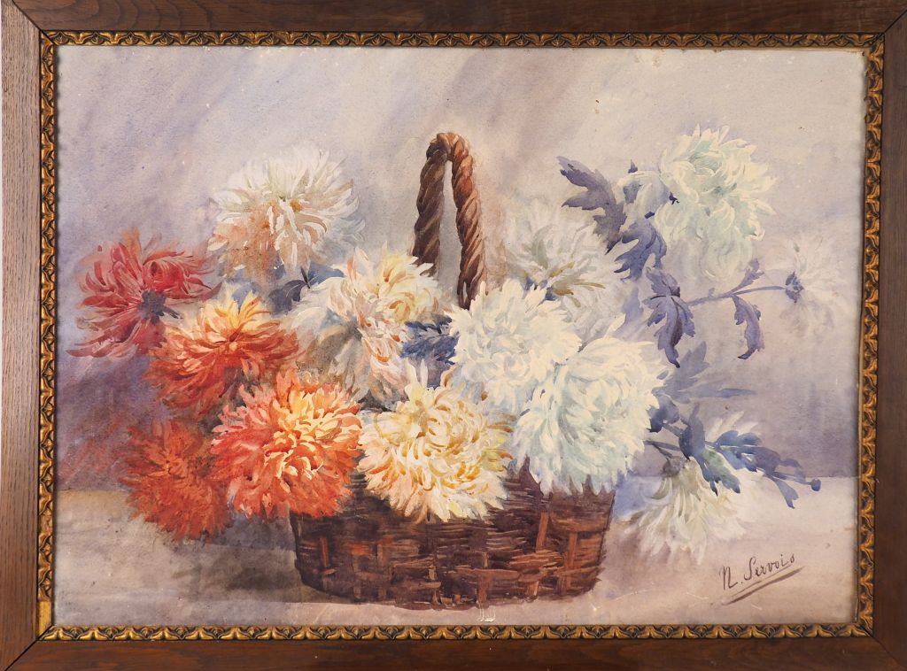 N. SERVOIS. "Bouquet de Chrysanthèmes dans un panier en osier". Aquarelle signée en bas à droite. Dim. 55 x 76,5 cm.