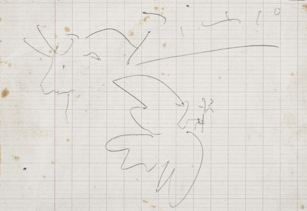 Pablo PICASSO. "Colombe et taureau". Stylo bille bleu sur papier ligné d'écolier, signé en haut à droite. Circa 1963. Dim. 9,5 x 14 cm. (quelques rousseurs et salissures, très petite déchirure sur le bord gauche) Un certificat de Picasso Authentification sera remis à l'acquéreur. Expert : Cabinet Maket