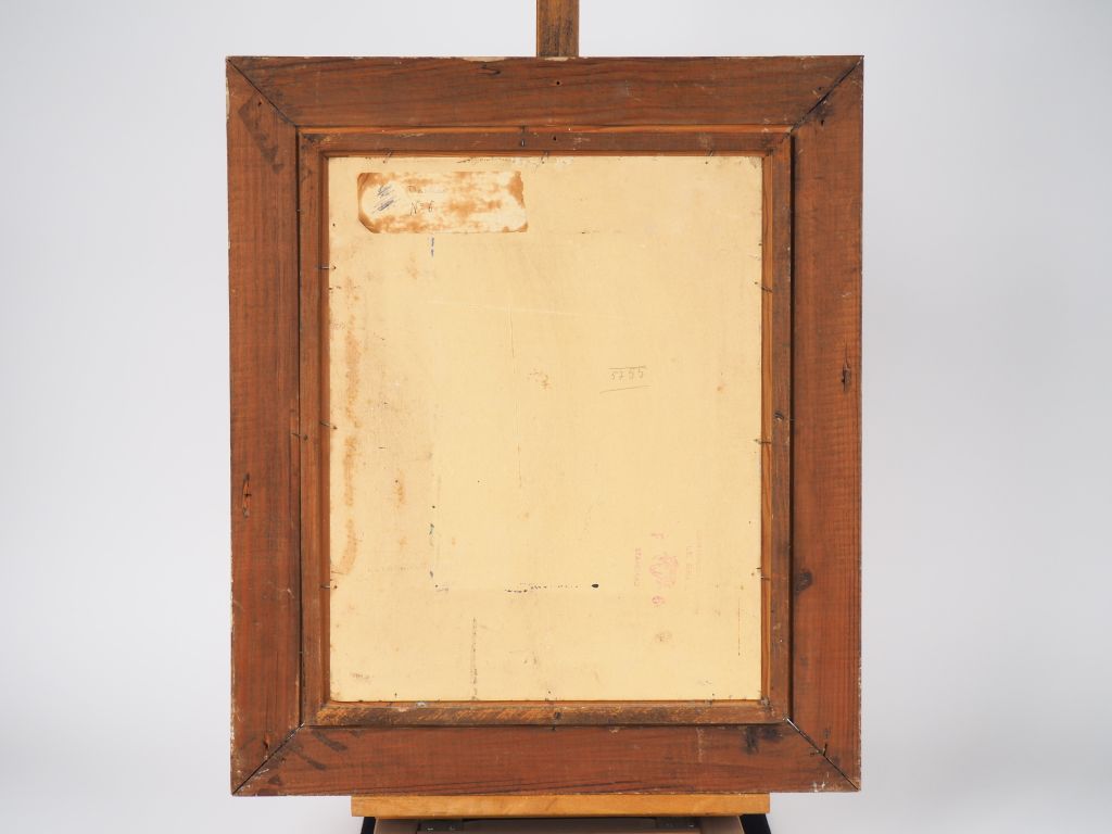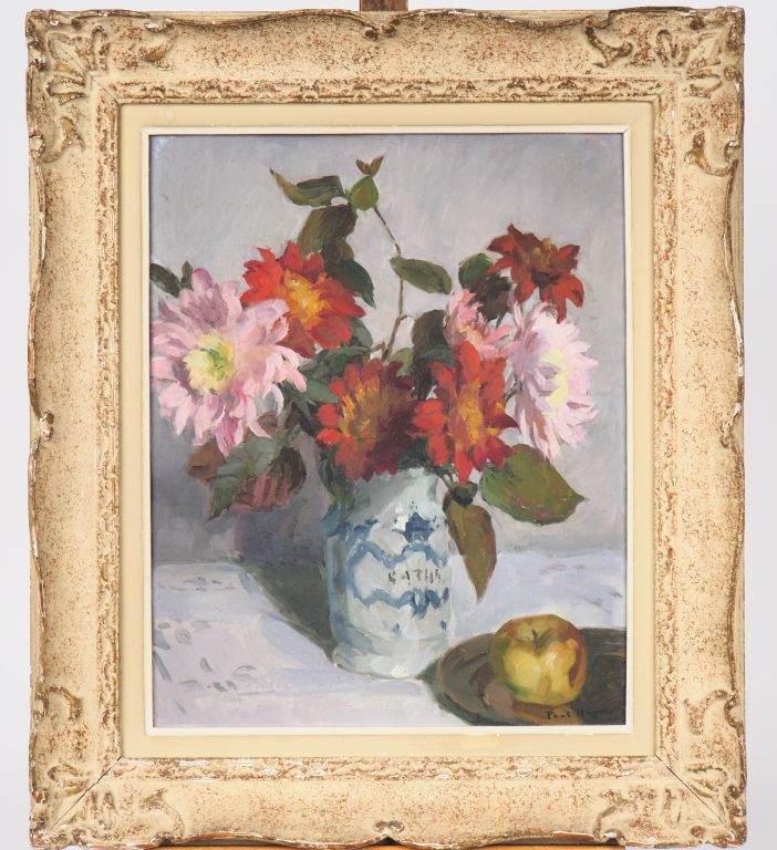 Paul Jean HUGUES. "Le bouquet de dahlias". Huile sur carton, signée en bas à droite. Dim. 41 x 32,5 cm.