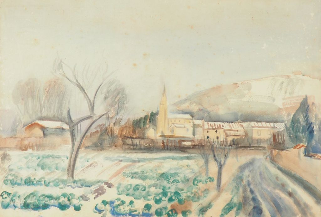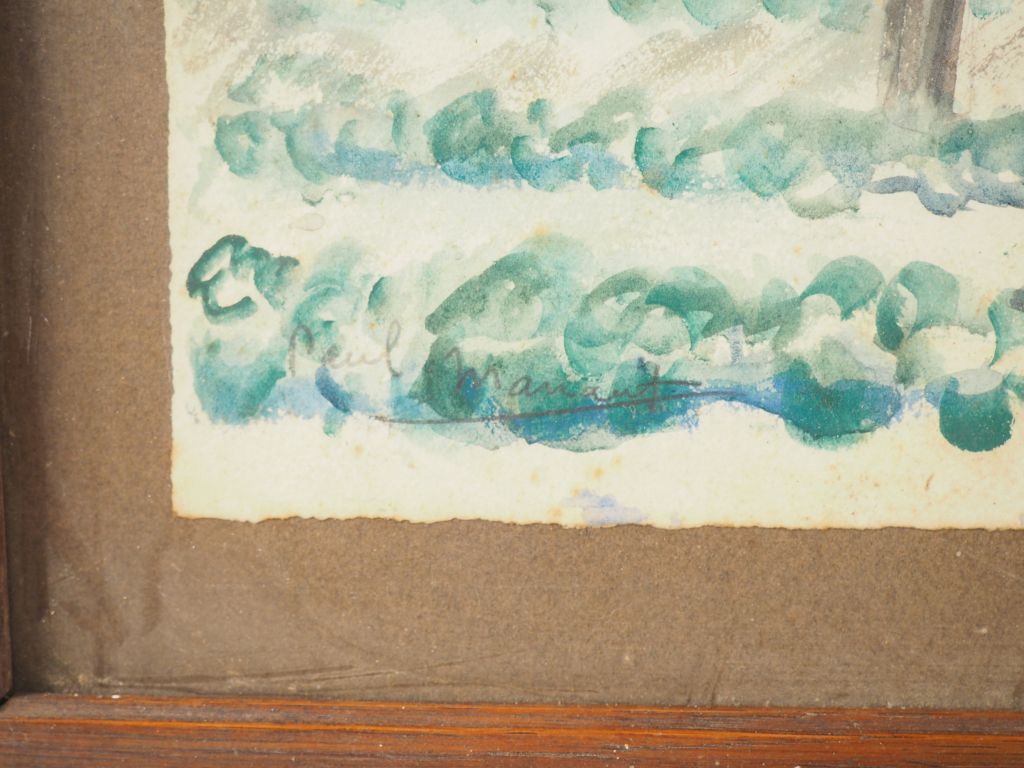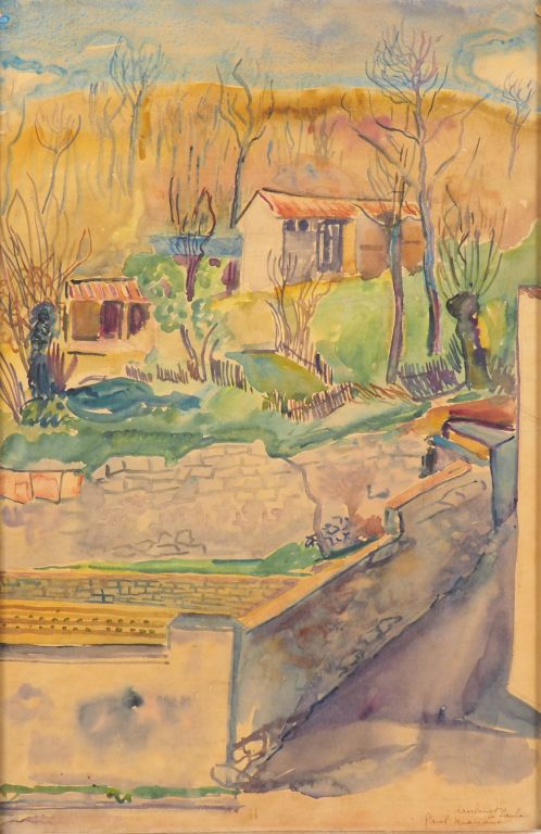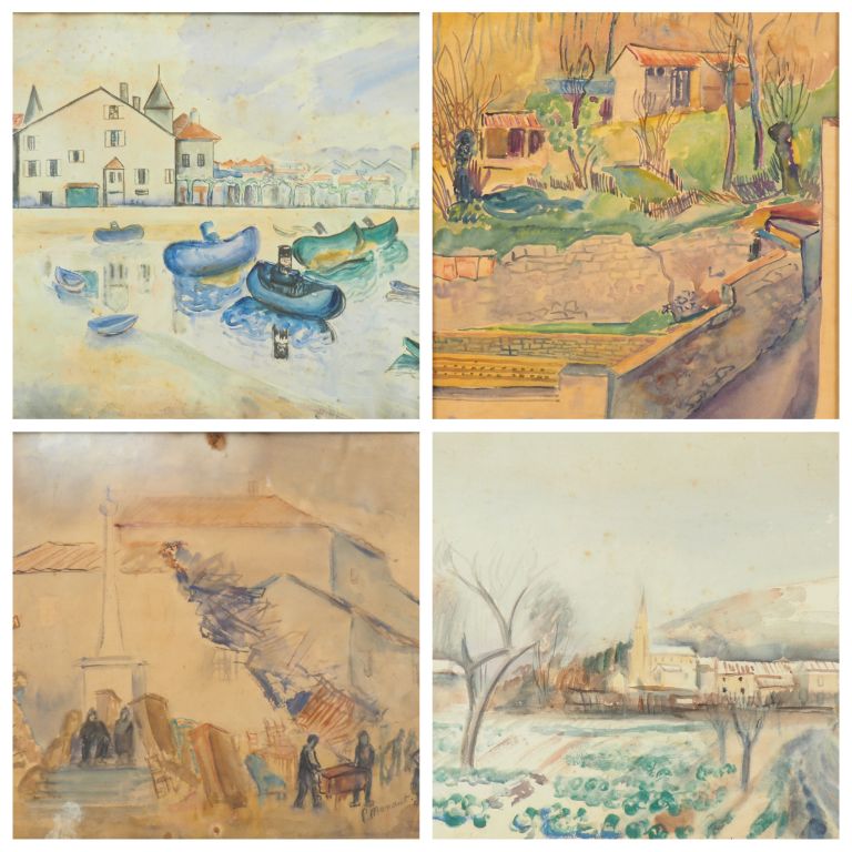 Paul MANAUT. 4 différentes aquarelles "marché aux puces", "village", "paysages", "marine"
