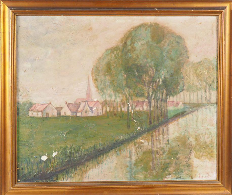 Paul MANAUT. "Village en bordure de rivière" Huile sur toile, signée en bas à droite Dim. 60 x 73 cm (accidents) on y joint Paul MANAUT. "Chateau de Foix" Huile sur toile, non signée Dim. 64,5 x 81 cm