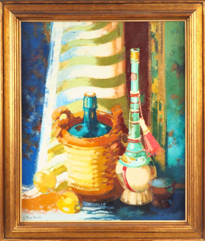 Pierre BOUDIN. "La bouteille de Chianti". Huile sur toile, signée en bas à droite. Dim. 73,5 x 60,5 cm