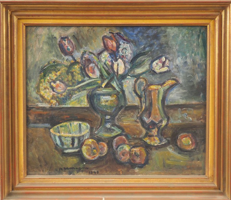 Pinchus KREMEGNE. "Nature morte aux fleurs et aux fruits" Huile sur panneau d'isorel, signée en bas à gauche et datée 1949 Dim. 50 x 59,5 cm