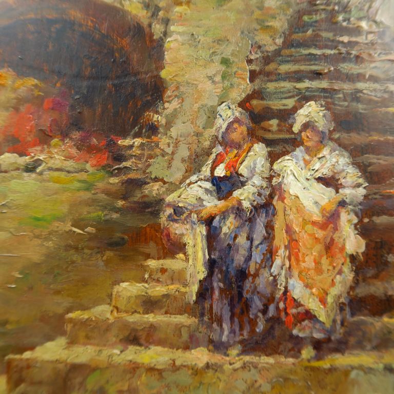 R. FORCADE. "Les lavandières". Huile sur panneau, signée en bas à droite. Dim. : 41,5 x 28 cm.
