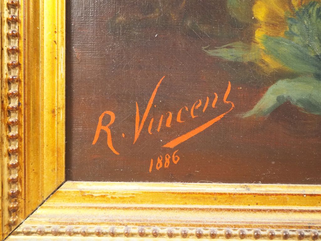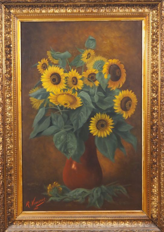 R. VINCENT. "Le bouquet de tournesols" Huile sur toile, signée en bas à gauche et datée 1886 Dim. 100 x 64 cm (Petit accident)