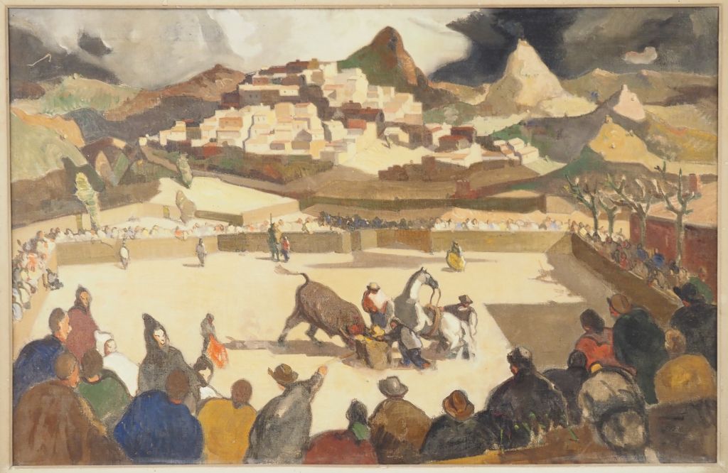 Rafael DURANCAMPS. "Scène de Corrida" Huile sur toile, signée au dos et datée septembre 1936 Dim. 60 x 92 cm Porte l'étiquette de la Galerie Chappe