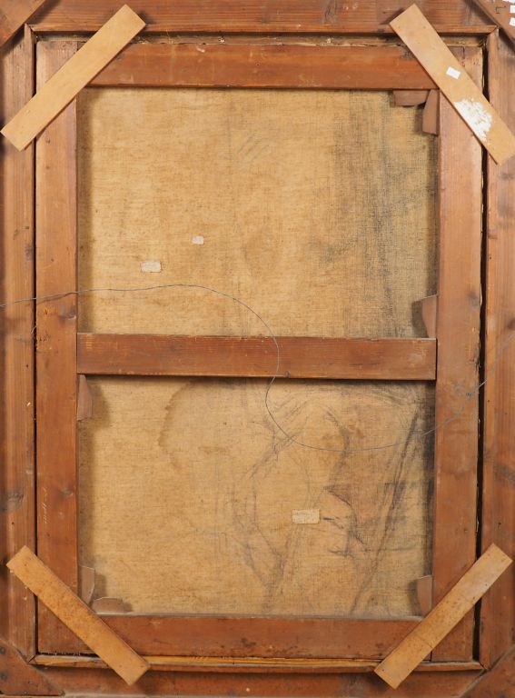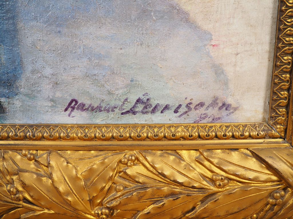 Raphael LEWISOHN. "Paysanne et son enfant revenant des champs". Grande huile sur toile signée et datée en bas à droite, dans un superbe cadre de styleLouis XVI en bois et stuc doré. Dim. 107 x 76 cm.