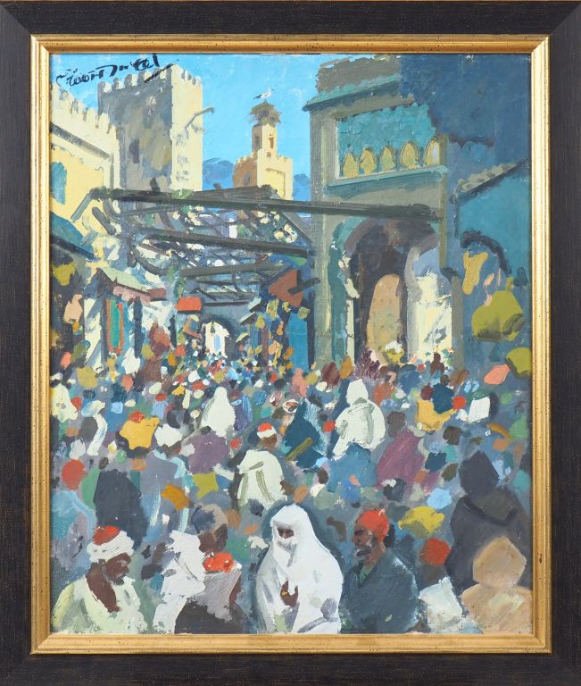 Raymond CRETOT-DUVAL. "Le souk en Afrique du Nord". Huile sur toile, contrecollée sur panneau, signée en haut à gauche. Dim. 55 x 45 cm.