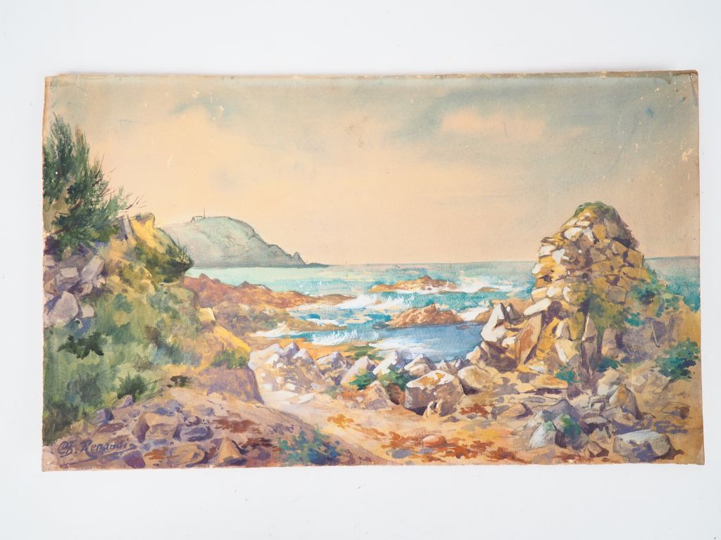 RENAUDIN. "La roche avec falaises sémaphore". Aquarelle signée en bas à gauche, titrée et datée 1928 au dos. Dim. 22 x 35,5 cm.