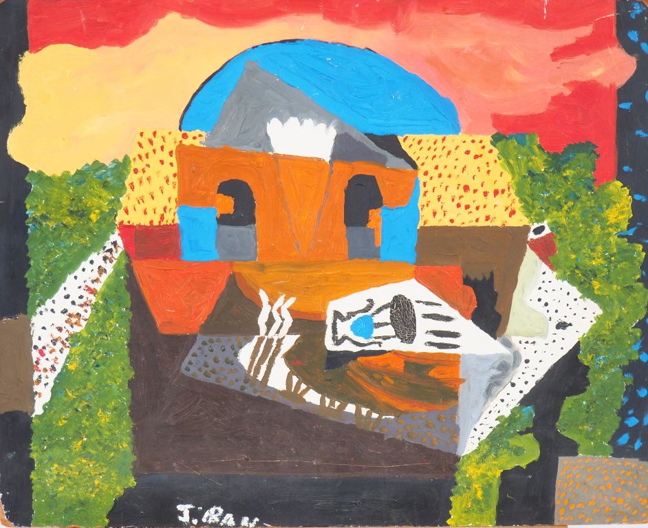 Robert JIRAN. "paysage cubiste" Huile sur carton, signée en bas à gauc...