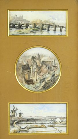 ROBIDA "Paysage et vues de ville". Trois dessins au crayon de couleur et à l'aquarelle, signés, dans un même encadrement.