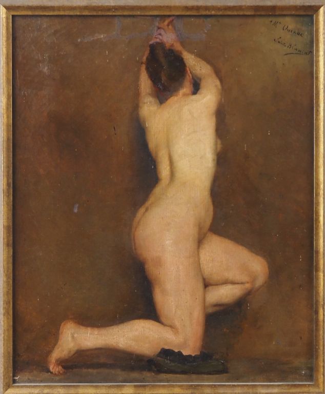 SAINT BLANCARD. "Modèle nue" Huile sur toile, signée en haut à droite. Dim. 46 x 38 cm (accident, restauration)