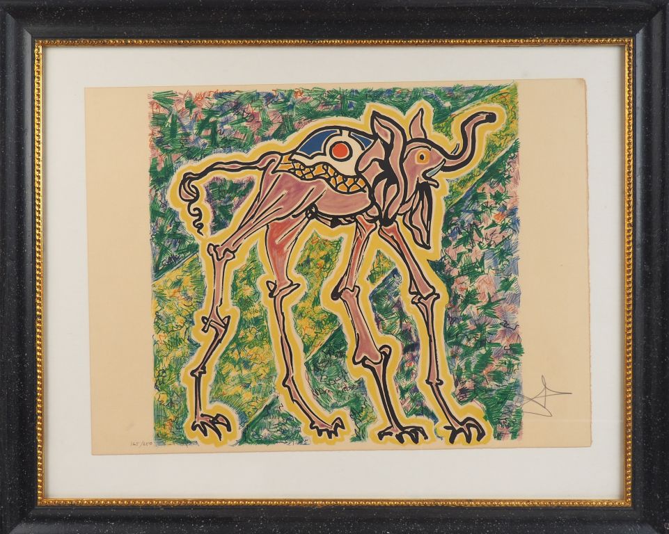 Salvador DALI. "L'éléphant rose" Lithographie en couleurs signée, numérotée 165/250. Dim. 47,5 x 65 cm.