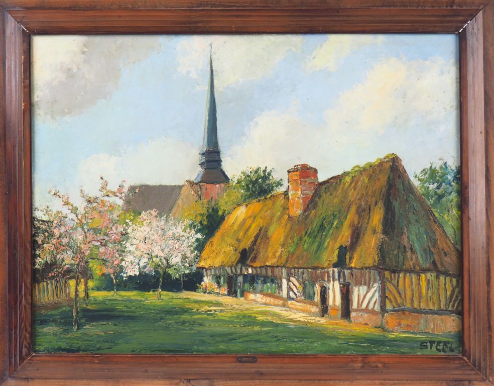 STEEL. "Chaumière derrière l'église". Huile sur panneau, signée en bas à droite. Dim. 59,7 x 79,7 cm.