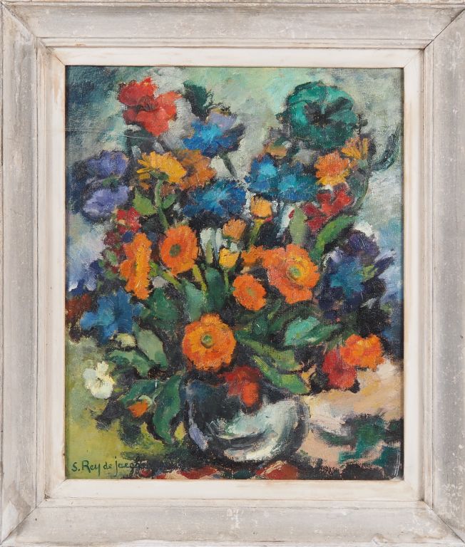 Suzanne REY de JAEGHER. "Bouquet de fleurs". Huile sur toile, signée en bas à droite. Dim. 46 x 38 cm