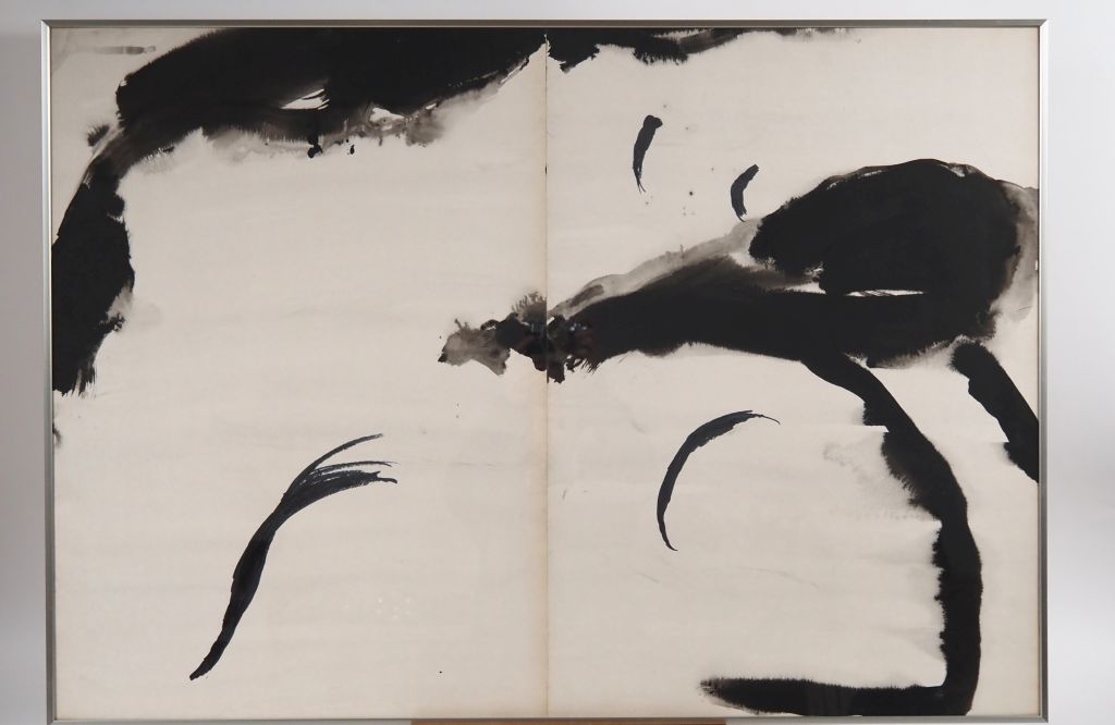 T'ANG HAYWEN. "Composition en diptyque". Encre sur papier Porte au dos le cachet d'huissier de l'inventaire réalisé par l'artiste dans son atelier. Dim. à vue : 70 x 100 cm Provenance : Collection particulière Toulouse (achat direct auprès de l'artiste de son vivant et dans son atelier). Expert : Cabinet Ansas, Papillon de Léry