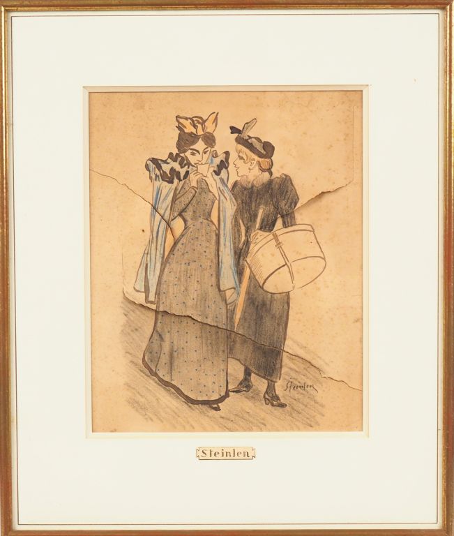 Théophile Alexandre STEINLEN. "Le jeune homme et la blanchisseuse" Dessin, signé en bas à gauche. Dim. 27 x 21,5 cm "Les coquettes" Dessin signé en bas à droite (déchiré) Dim. 27 x 21,5 cm