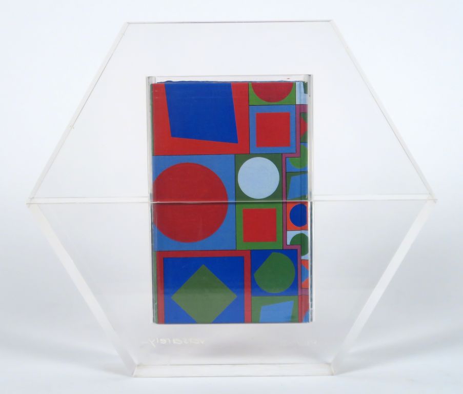 Victor VASARELY "Hexagone" Sculpture en plexiglas contenant quatre ouvrages sous couvertures inédites de Victor Vasarely. Signée et numérotée 0103/1500. Avec son certificat d'authenticité. 26 x 30 cm