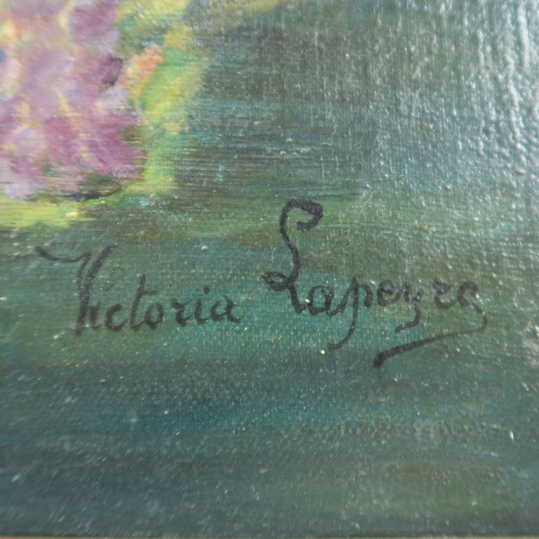 Victoria LAPEYRE. "Nature morte au bouquet de fleurs". Huile sur toile, signée en bas à droite. Dim. 54 x 65 cm.