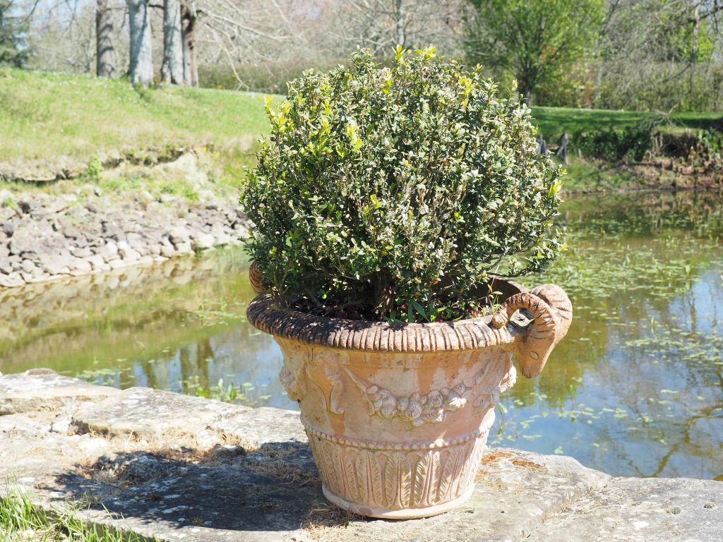 Lot de 4 jardinières en terre cuite à décor de têtes de béliers en relief. Di au prix de 100 à 150 € en vente aux enchères par l'hôtel des ventes Primardeco
