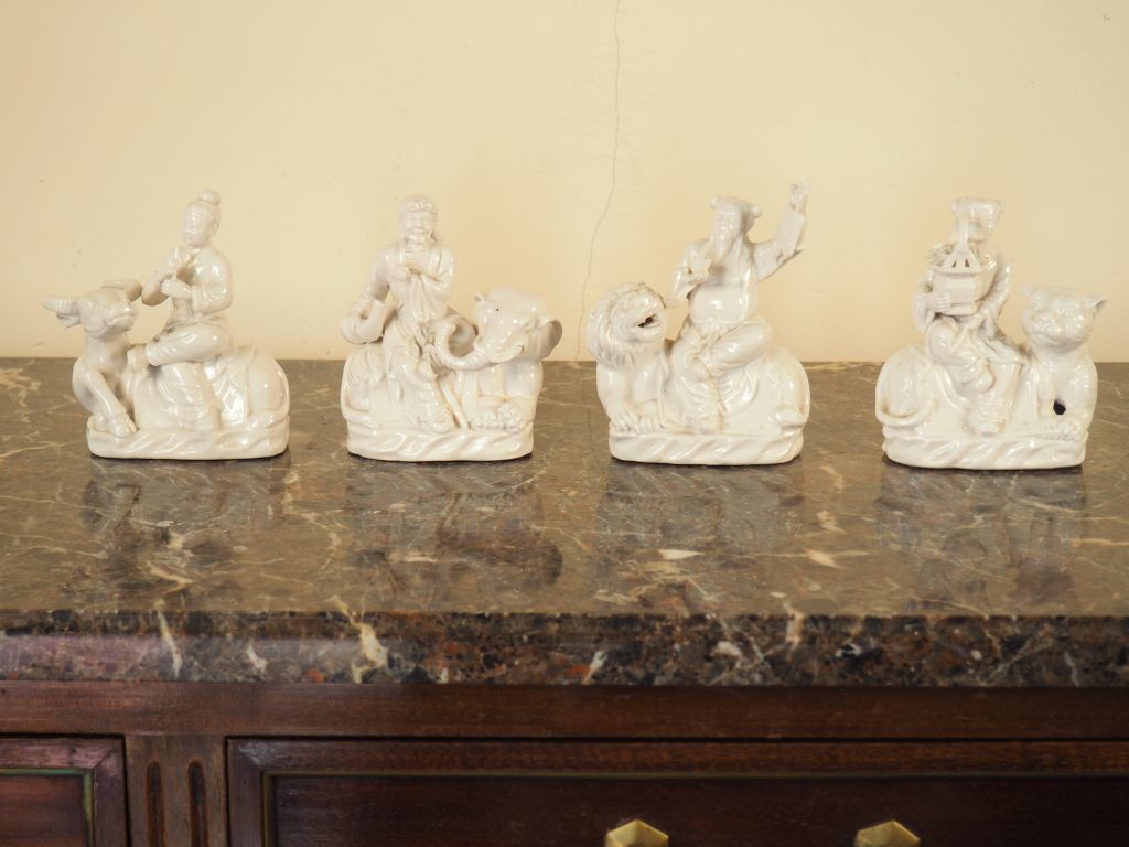 4 statuettes en porcelaine représentant des personnages extrême-orientaux. Dim. 14 x 9,5 x 6 cm.