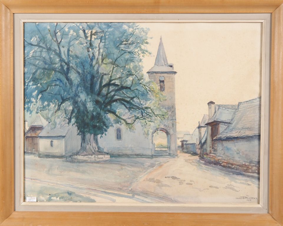 Lot de Aquarelle signée en bas à droite Boudet 'La place aux vieux chênes' au prix de 30 à 50 € en vente aux enchères par l'hôtel des ventes Primardeco