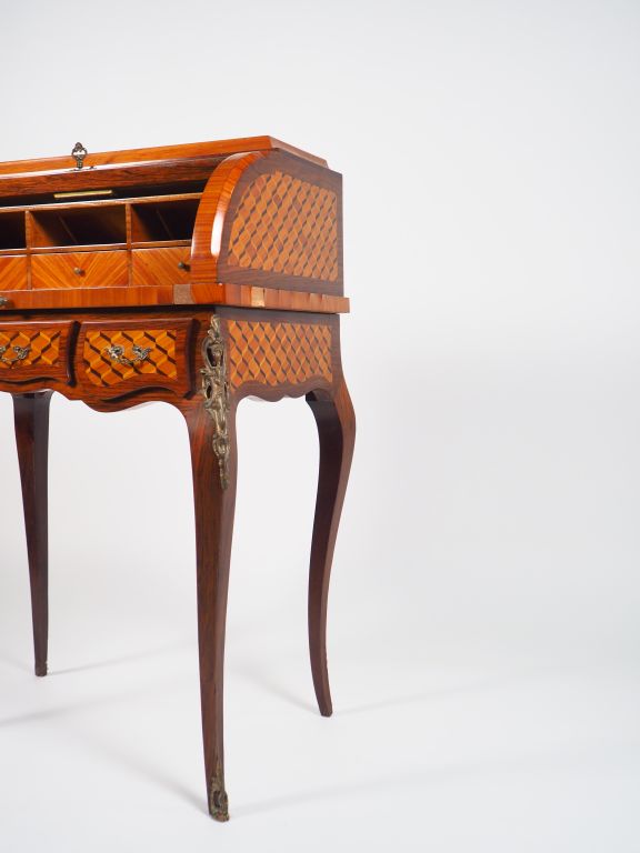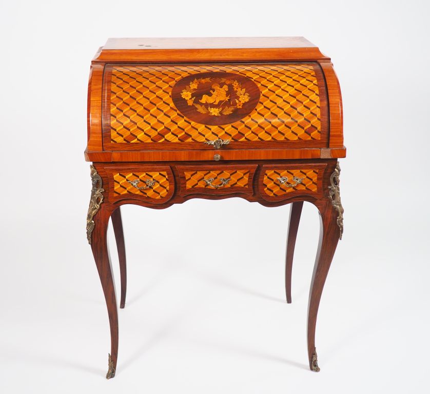 Bureau à cylindre de style Louis XV en marqueterie, à décor de cubes et ornementation de bronze ou laiton, ouvrant à trois petits tiroirs et un abattant coulissant. 100 x 70 x 47 cm