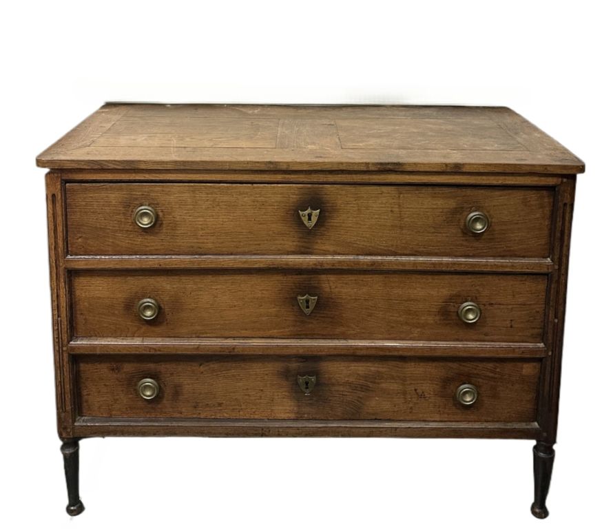 Commode XIXème de style Louis XVI en bois naturel, ouvrant à trois tiroirs, dessus plateau bois.