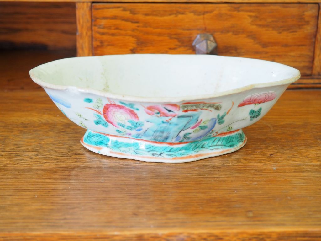 Coupe en porcelaine de Chine à décor polychrome de fleurs et d'oiseaux. Dim. 20,5 x 15,5 cm. (égrenures).
