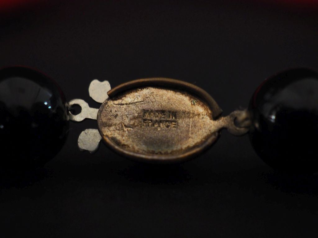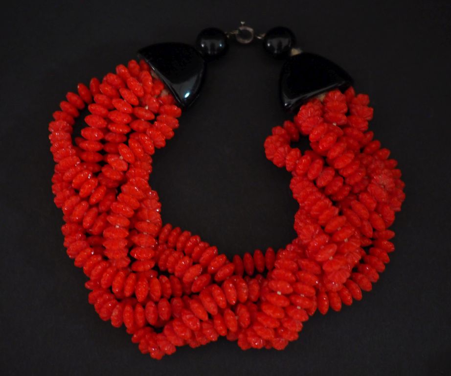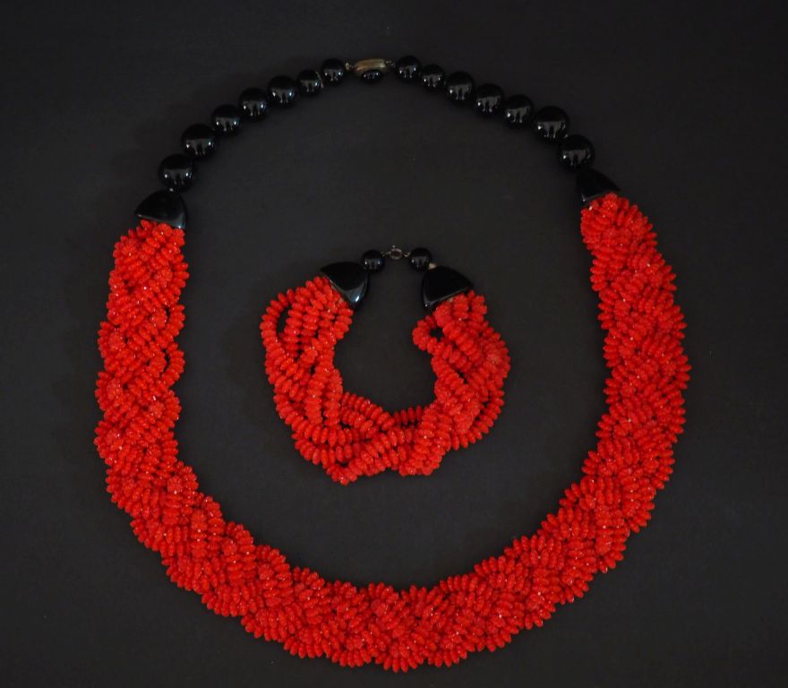 Demi parure fantaisie en perle imitant le corail et perles noires. Comprenant : - un collier maille tressée - un bracelet