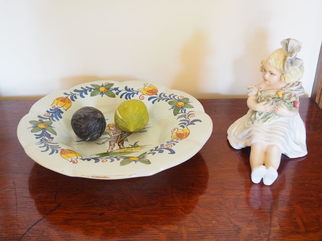 Deux fruits "figues" en trompe l'œil, un sujet "jeune fille en fleur" en biscuit polychrome, un plat en faïence polychrome.