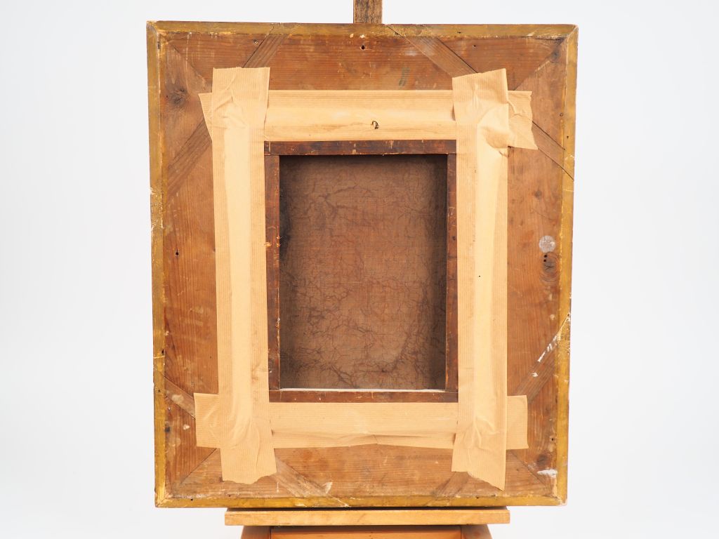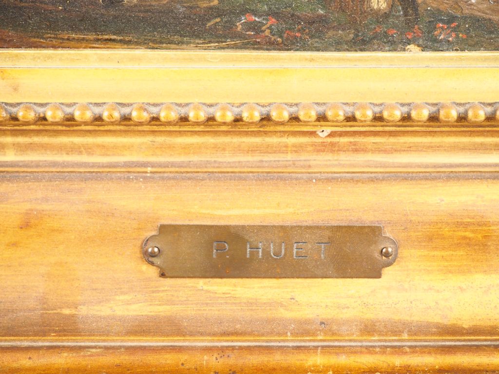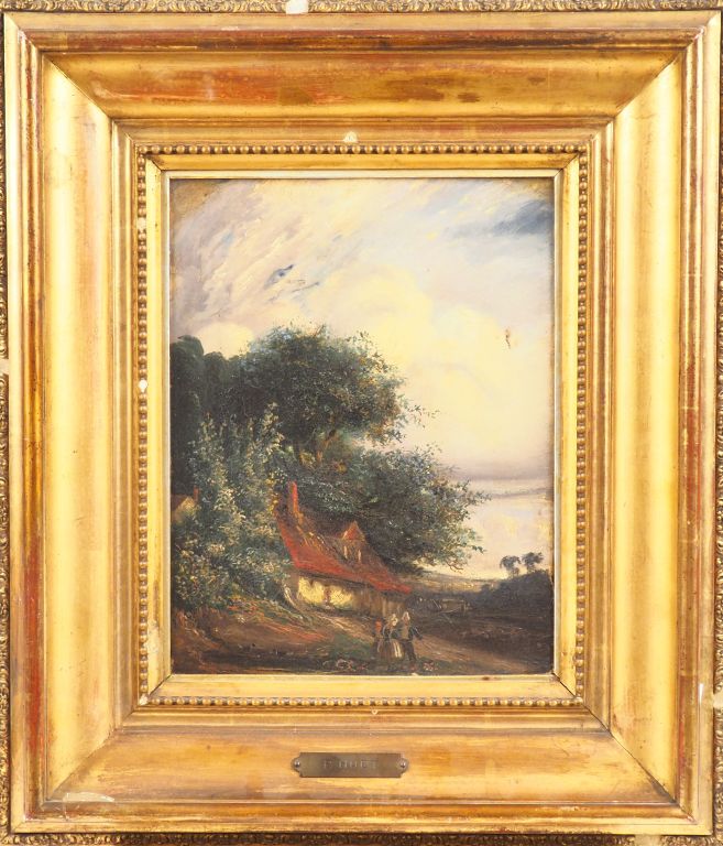 Ecole française. "Paysans devant leur chaumière". Huile sur toile non signée, cartouche de P. Huet sur le cadre Dim. 35 x 25 cm.