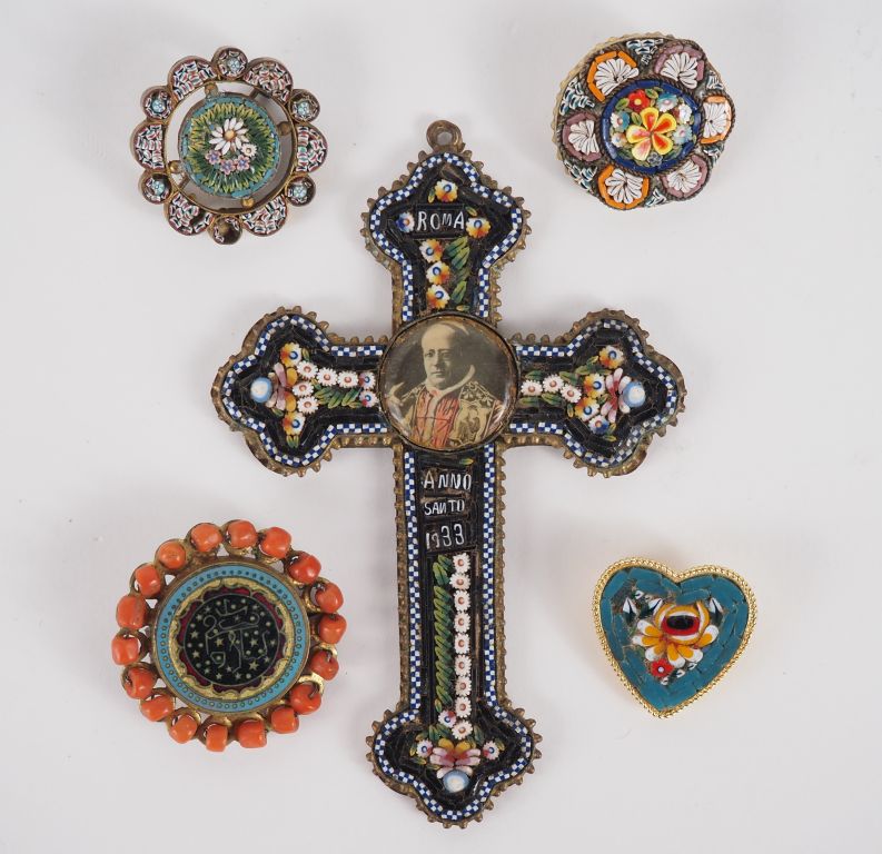 Ensemble comprenant : un crucifix et trois différentes broches en métal et micromosaïques. On y joint une broche ronde, à décor émaillé et agrémentée de perles à l'imitation du corail. (accident)